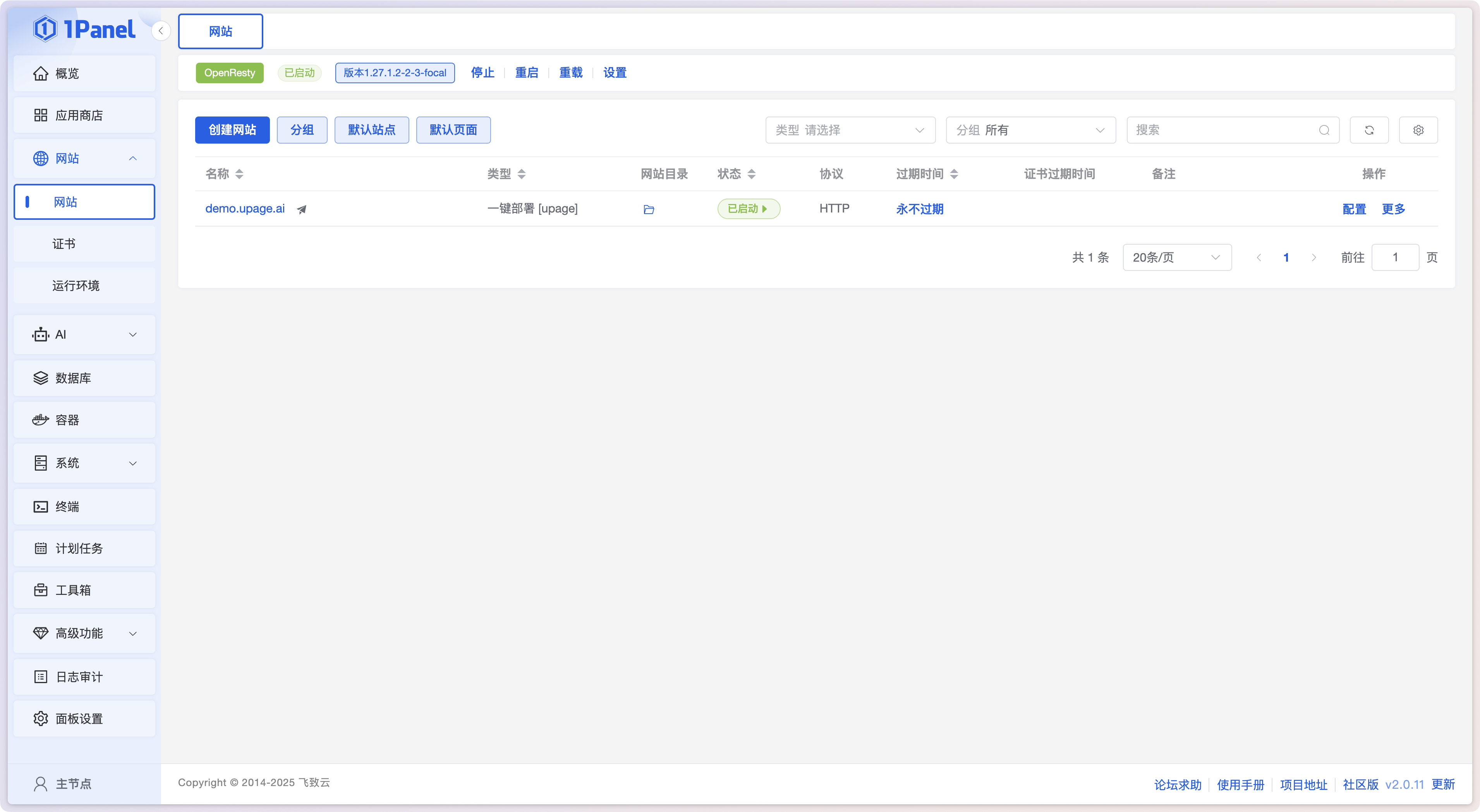 完成 UPage 应用的安装后,此时并不会自动创建一个网站,我们需要手动创建一个网站,然后将 UPage 应用绑定到这个网站上才能使用域名访问。