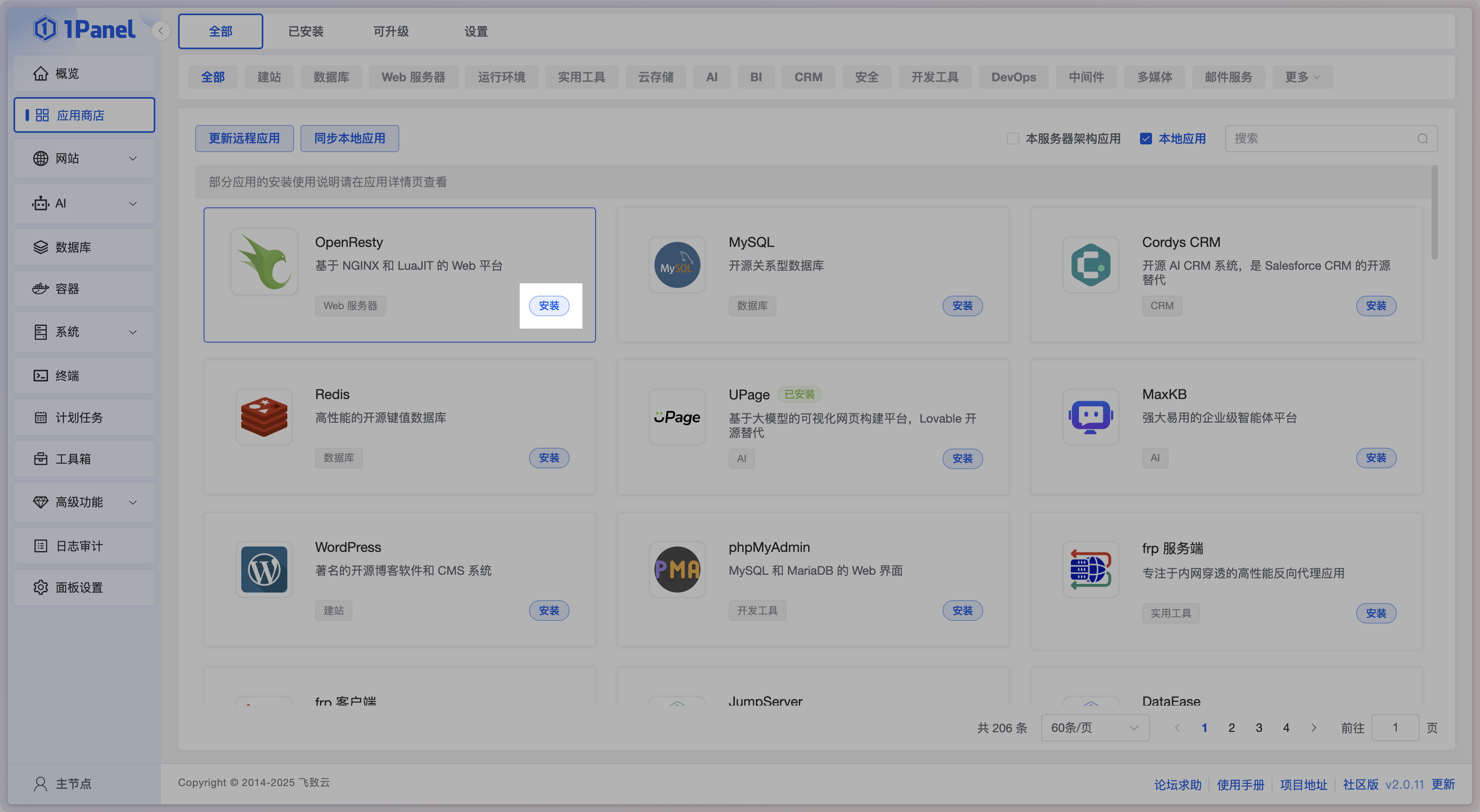 点击 1Panel 菜单的 应用商店,找到 OpenResty 应用,点击 安装 按钮进行安装。