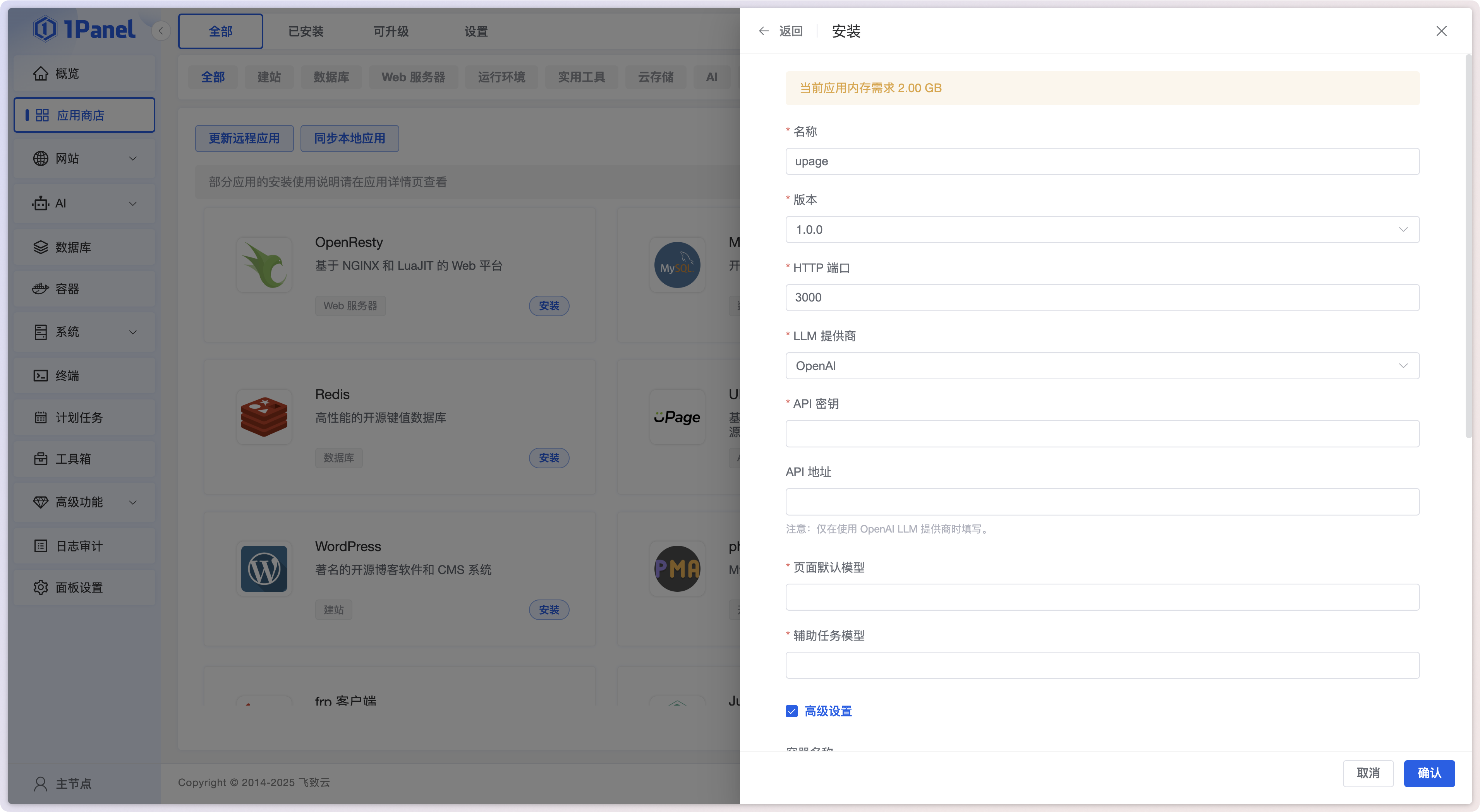 在应用详情页面,选择最新版本的 UPage 进行安装,并按照页面属性完成配置。