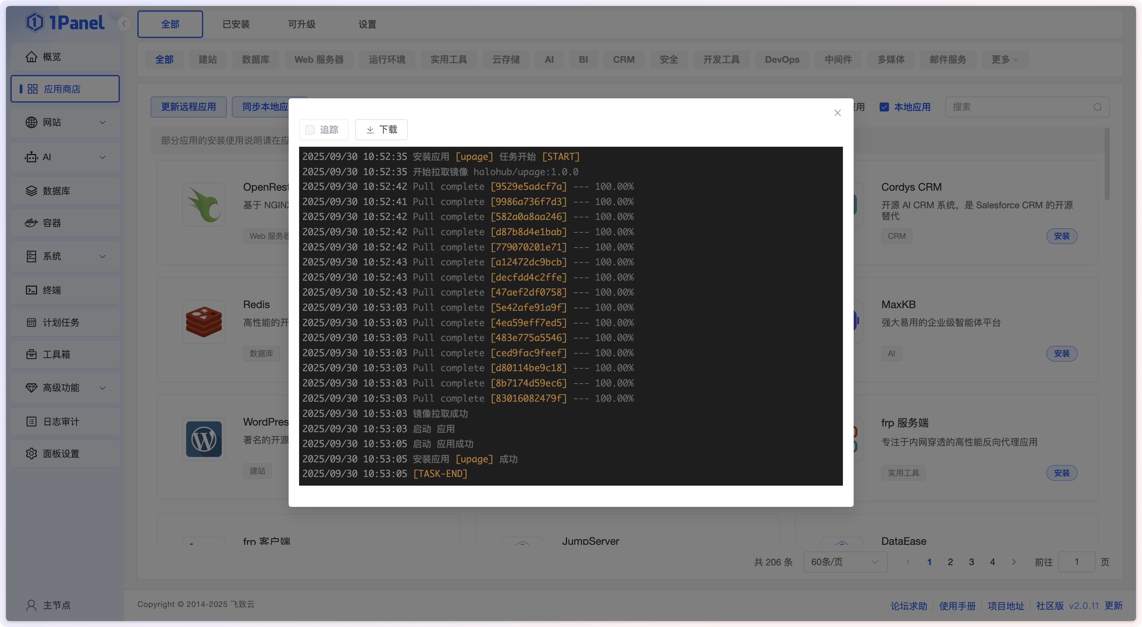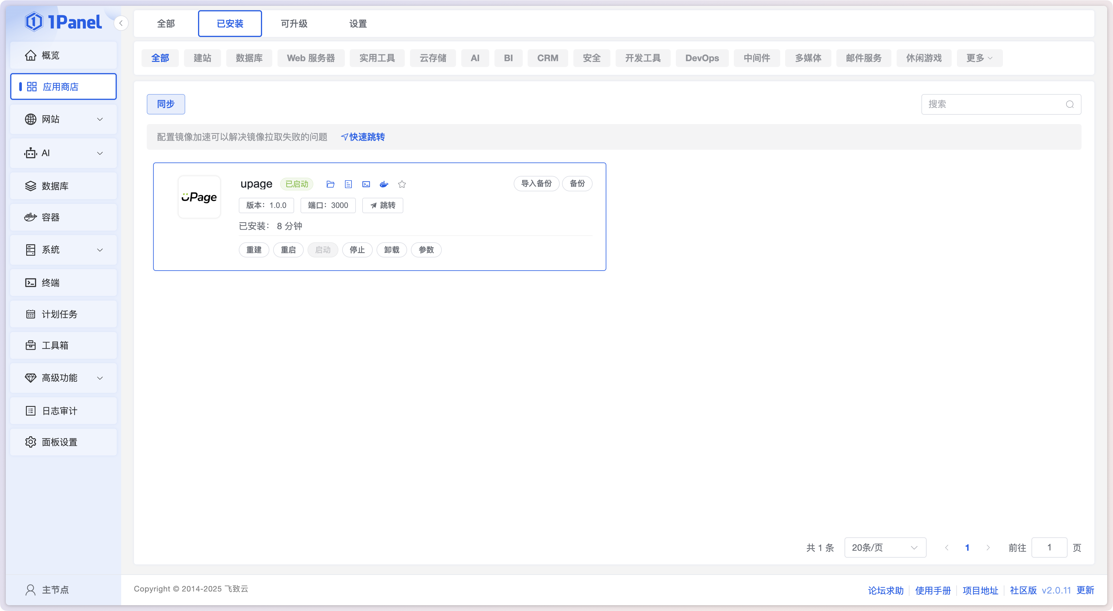 安装完成后,可以看到刚刚安装的 UPage 应用已经变为 已启动