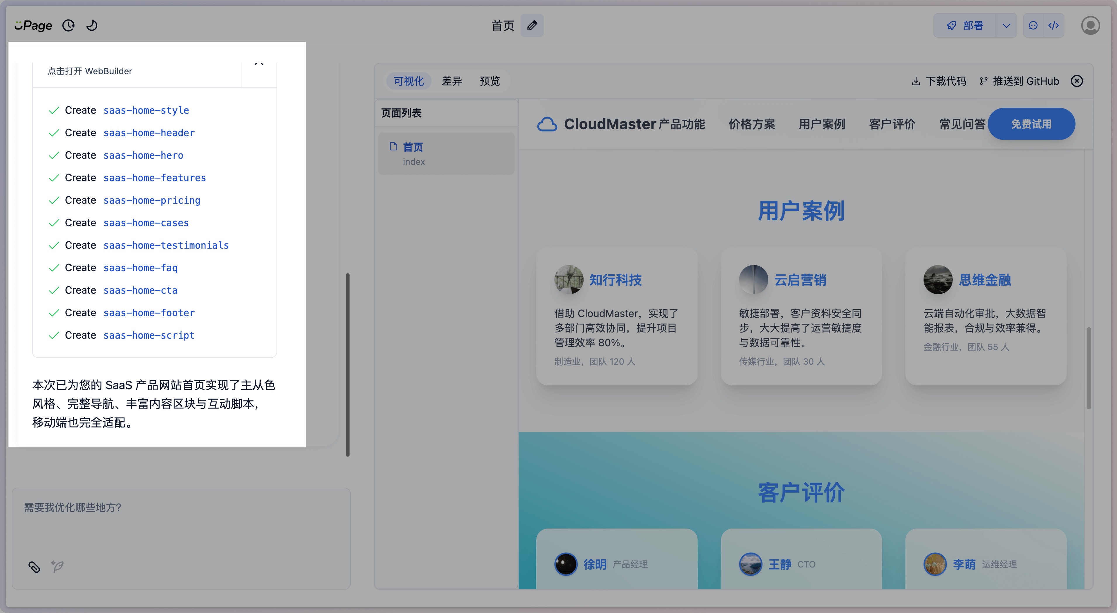 会话及生成界面是 UPage 的核心功能界面,用户可以在此界面中与 AI 进行多轮对话,生成网页。