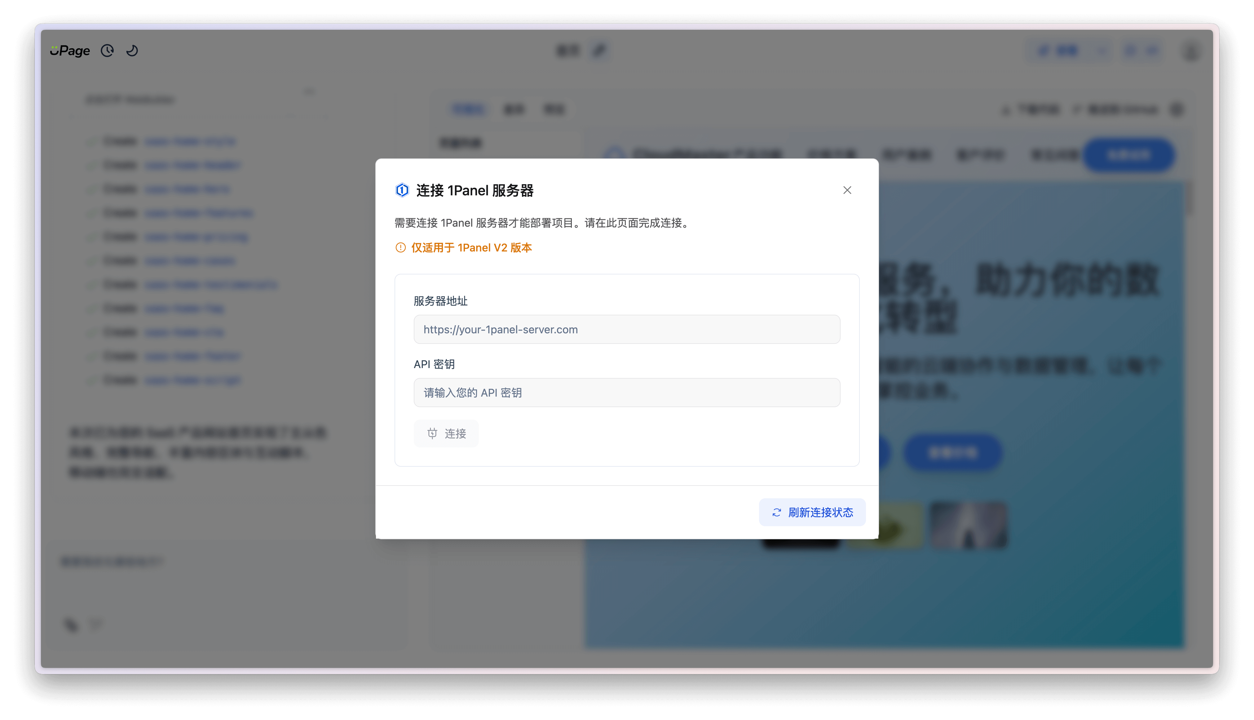 首次部署时,会弹出连接 1Panel 的对话框,用户需要在此对话框中填写 1Panel 的连接信息。