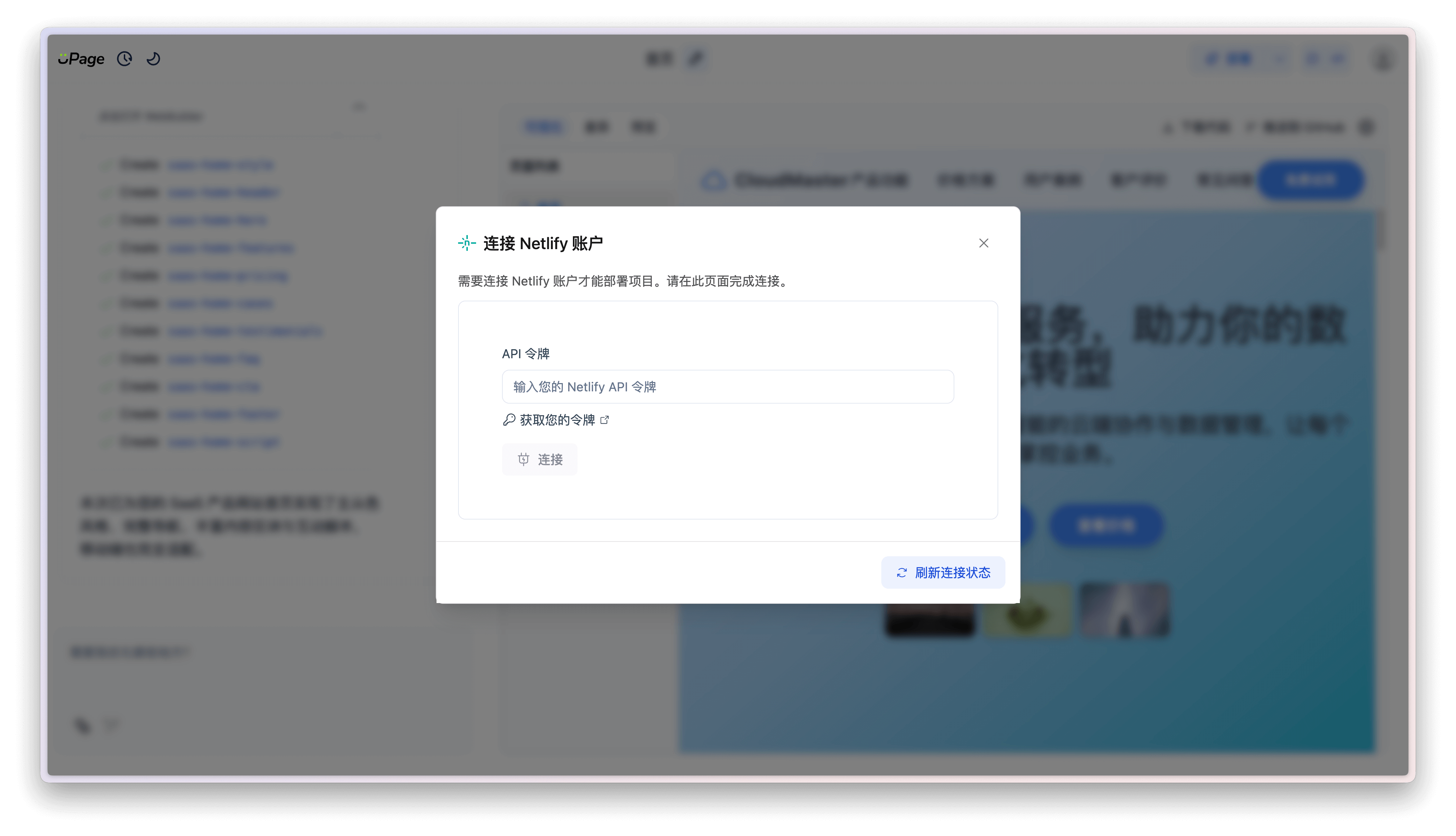 在此对话框中,用户需要填写 Netlify 的 访问令牌。