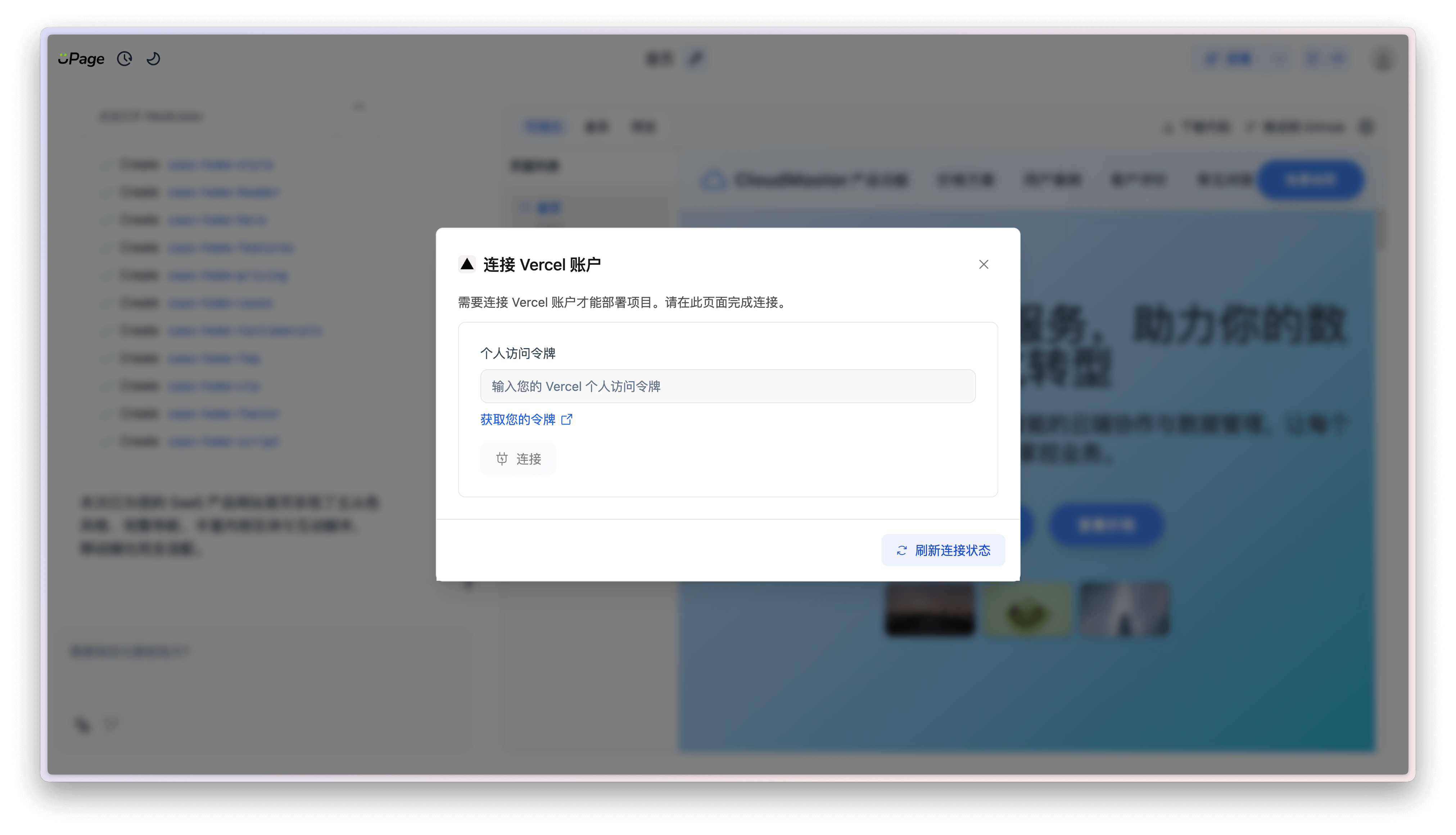 在此对话框中,用户需要填写 Vercel 的 访问令牌。