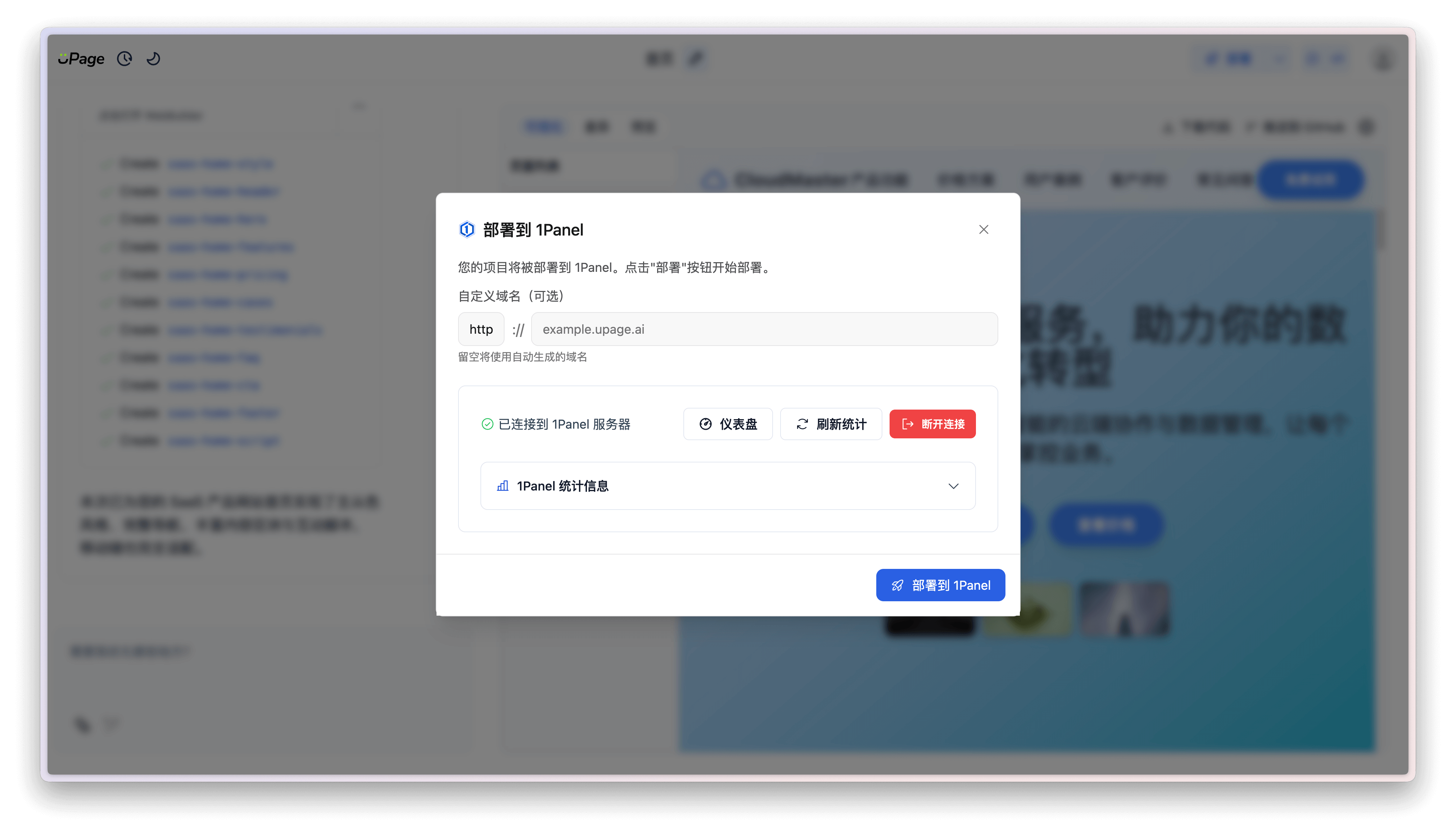 填写完成后,点击连接按钮,会打开部署至 1Panel 的对话框。