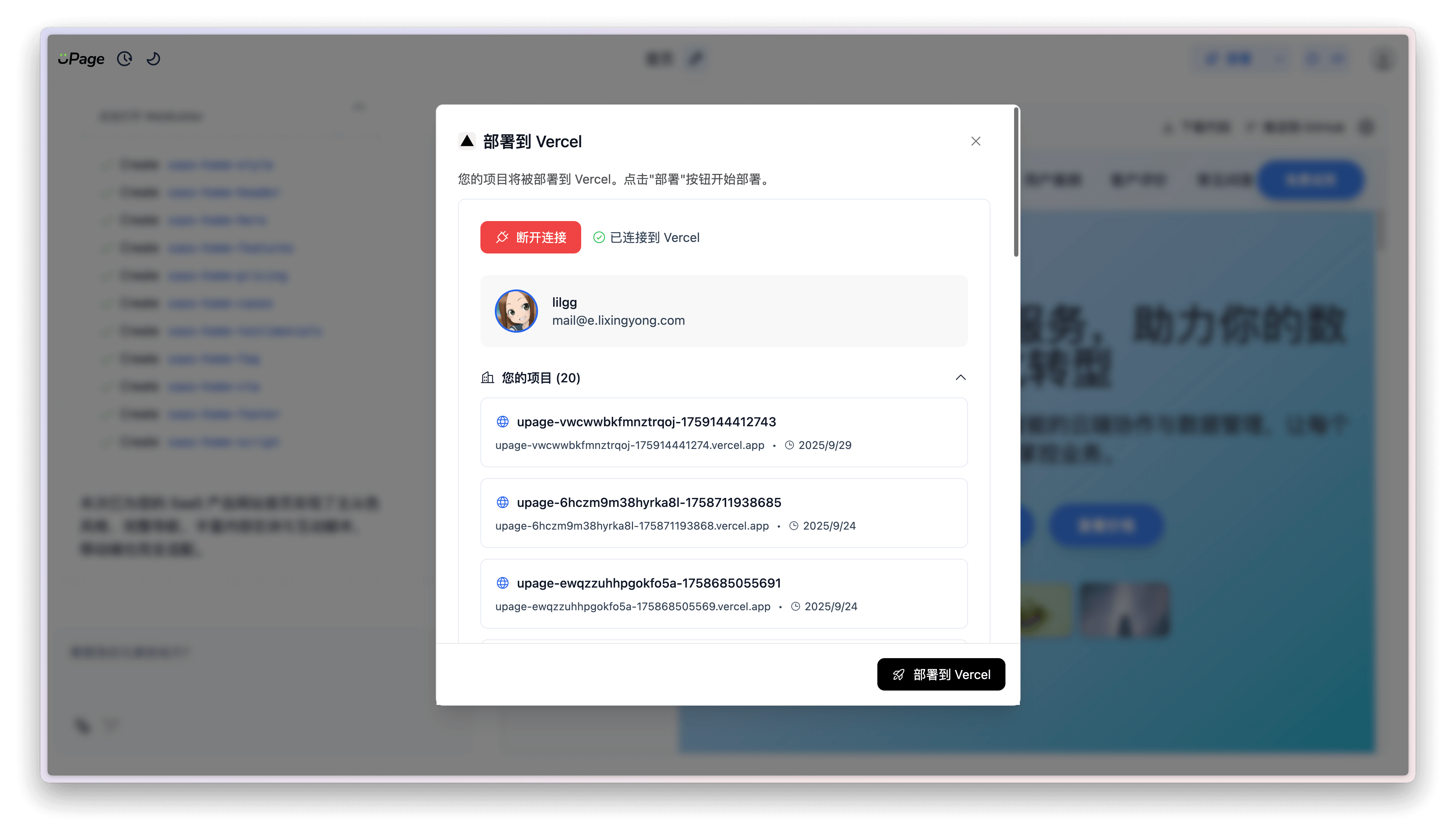点击 部署到 Vercel 按钮后,会自动将生成的页面部署至 Vercel 中。
