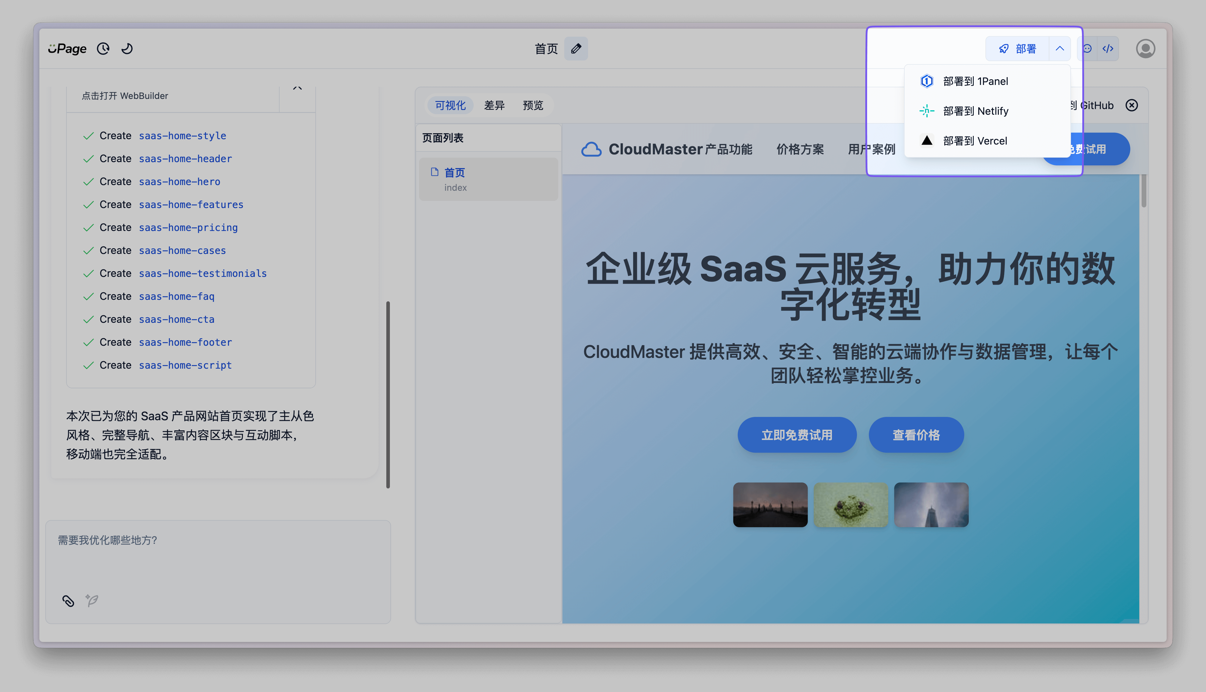 当页面生成完成之后,可以使用部署功能区将生成的页面部署至 1Panel、Netlify、Vercel 等平台。
